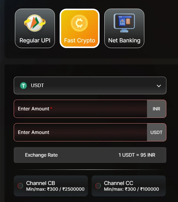 As mentioned above, you can use three payment modes to make a deposit on FOMO7. The FOMO7 minimum deposit amount is ₹300. If you use a crypto wallet for payment, you can deposit as little as ₹300. On the other hand, the minimum deposit amounts for Regular UPI and Netbanking are ₹500 and ₹3000, respectively.